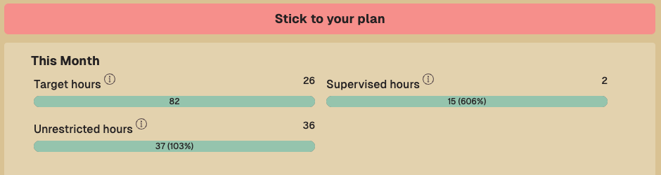 As the developer for a tracker, concentrated hours create a conundrum for me. I want to show all my users a plan for each month that shows them exactly what they need to do. You should be able to glance at the dashboard and know how many more hours you need to complete this month, how many of them need to be unrestricted, and how many observations you need. But when it comes to concentrated hours, it becomes more confusing. Do I show them how many "true" hours they need to complete before applying the 1.33 multiplier? What if someone gets confused and thinks those are the hours after the 1.33 multiplier? I implemented several difference versions of this, which took many, many hours of time. First, I created a toggle that allowed people to apply the 1.33 multiplier to all the numbers. But that could mislead people who haven't completed the concentrated requirements yet. I played around with different ways of displaying the data, but they all had drawbacks. Ultimately, I decided not to make the same mistake as the BCBA handbook. That means all the hours in the month are targeting the 2,000 total hours to complete, and if you complete the requirements for concentrated hours, it will automatically multiply that month's hours by 1.33.